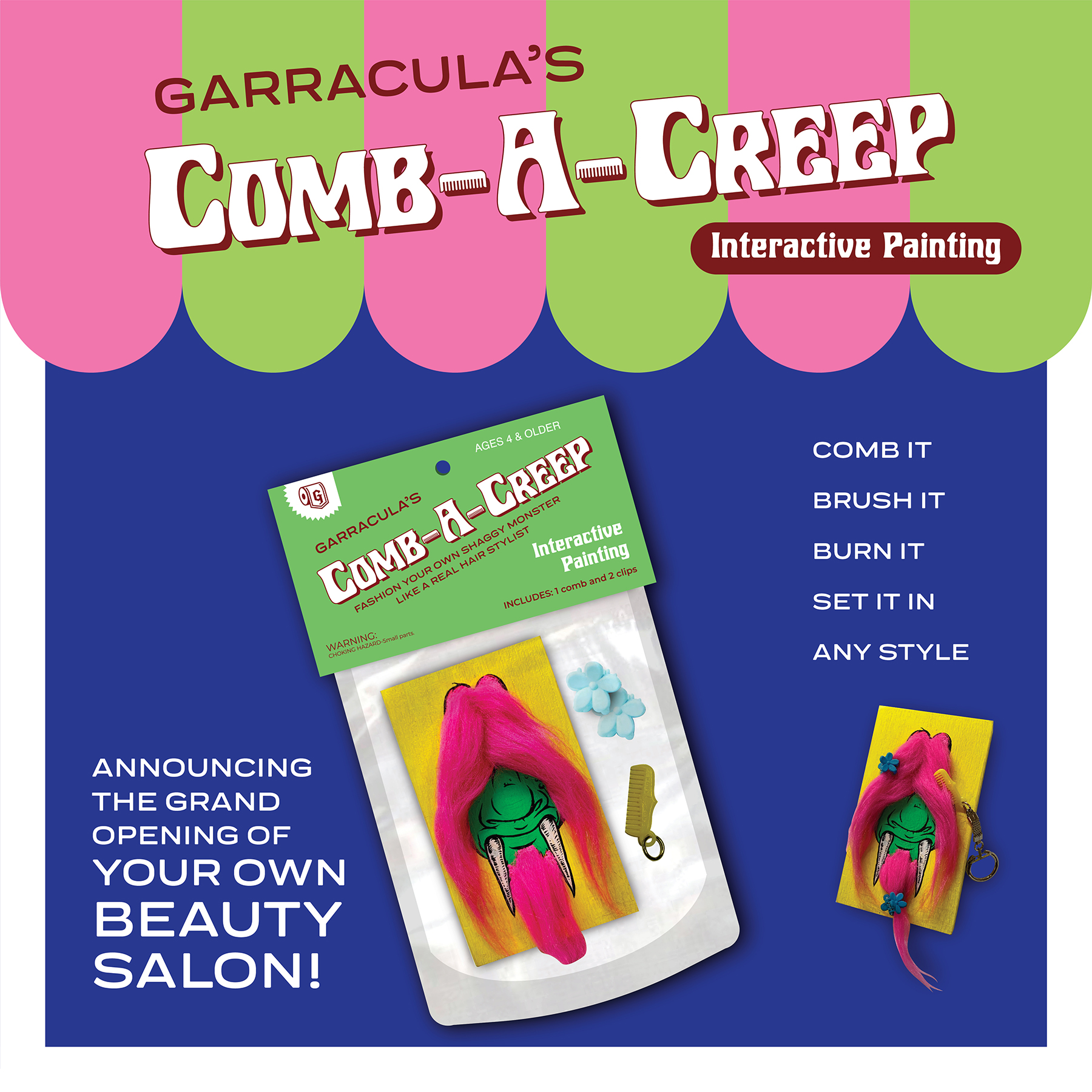 Announcing the grand opening of your own beauty salon! Now you can fashion your very own shaggy monster like a real hair stylist! These interactive paintings come custom with two hair clips and a hangable hair brush charm keychain!